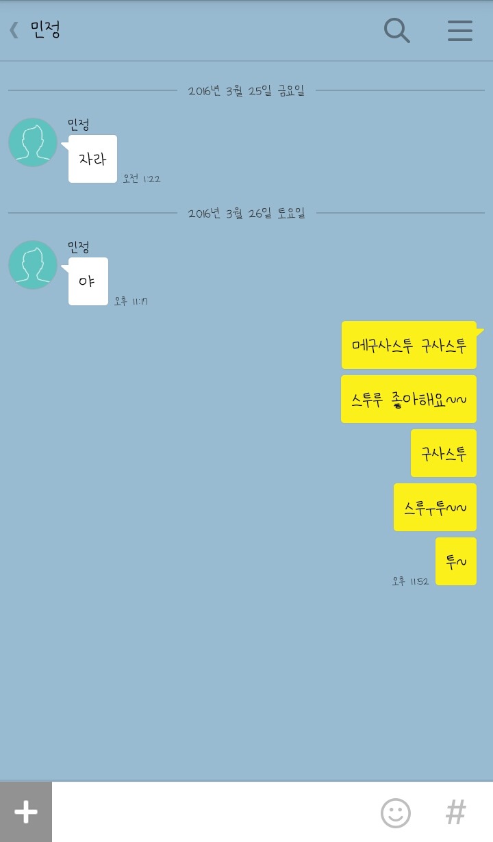 실제 카톡에서도 저 버튼을 누르면 진해지는데 왜 가짜톡이 저렇게 진하냐면 이 조작어플 자체에서 캡쳐기능을 제공해주는게 있는데 그게 바로 이 + 버튼을 누를때야. +버튼이 눌리면서 기기자체 캡쳐가 아니라 상단바는 잘리면서 캡쳐가 돼