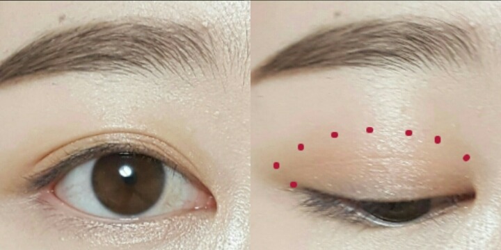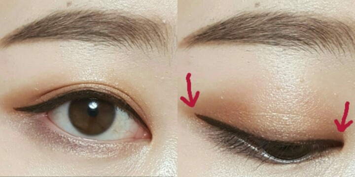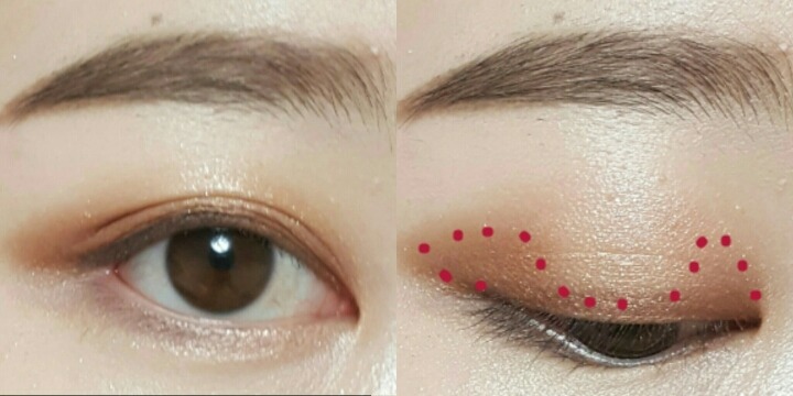 그리고 눈을뜬상태에서 눈꼬리부분을 붓이나 면봉으로 쓱 올려줘! 빨간선안쪽은 2번섀도우 또는 먹색이나 블랙 섀도우로 덮어주는거야. 삼각존은 펜슬아이라이너를 사용해서 조금만 칠해줘..ㅠㅠ 여기선 아이브로우를 썼어..