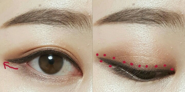 오늘은 아이라인을 앞쪽부터 칠할건데 화살표가 표시된 부분까지 그리는거야.