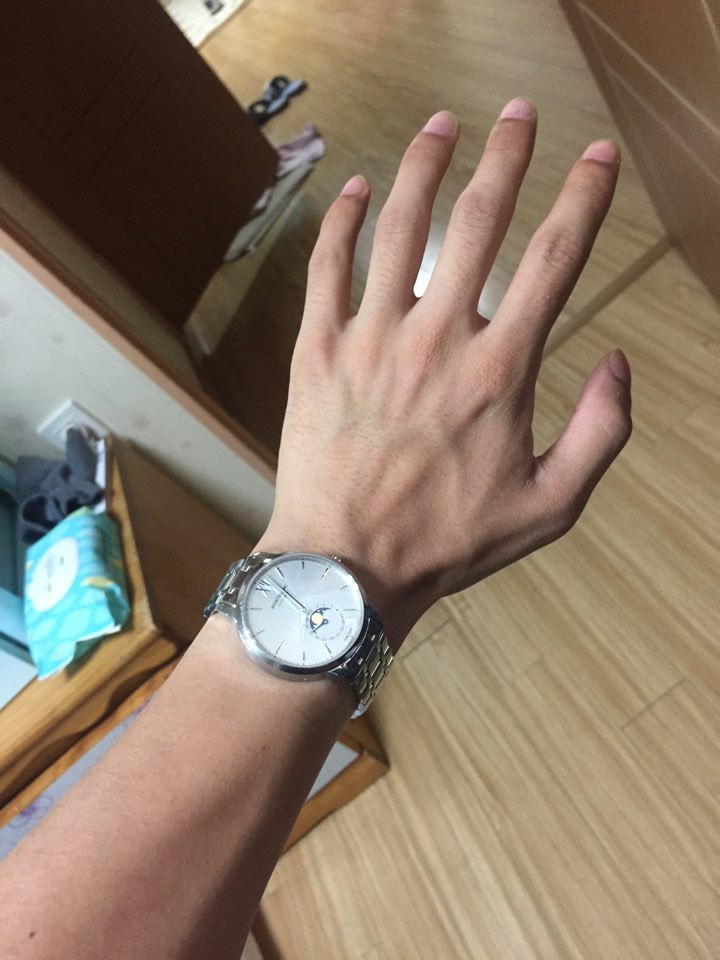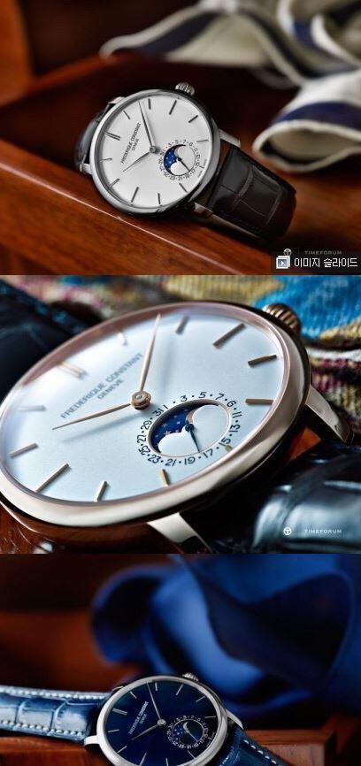 프레드릭 콘스탄트에 슬림라인 문페이즈 라는 모델이고 프레드릭 콘스탄트라는 브랜드가 설립한지 오래되진않았지만 특이하게 시계안의 무브먼트라는 부품을 자기네들이 직접만드는 몇안되는 회사이며(몇백만원짜리 시계에 공용으로 쓰는 무브먼트 조금수정해서넣는 회사들 널리고널렸음)