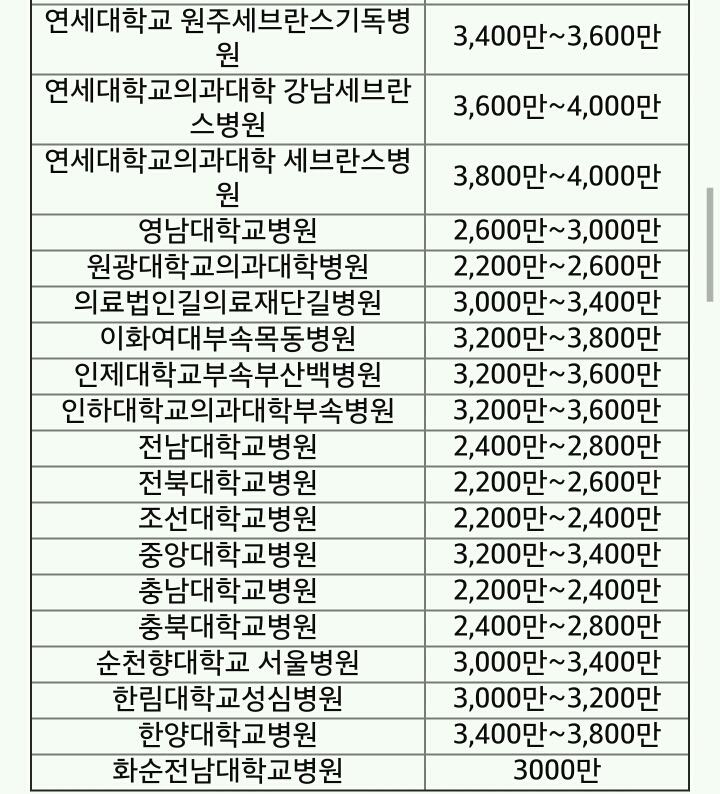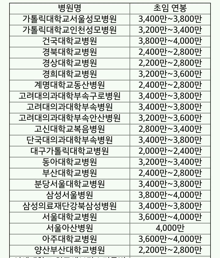 모 대학병원들은 초봉이 월 200도 안되고, 종합병원임에도 월 300만원이 넘게 주는 병원도 있다.