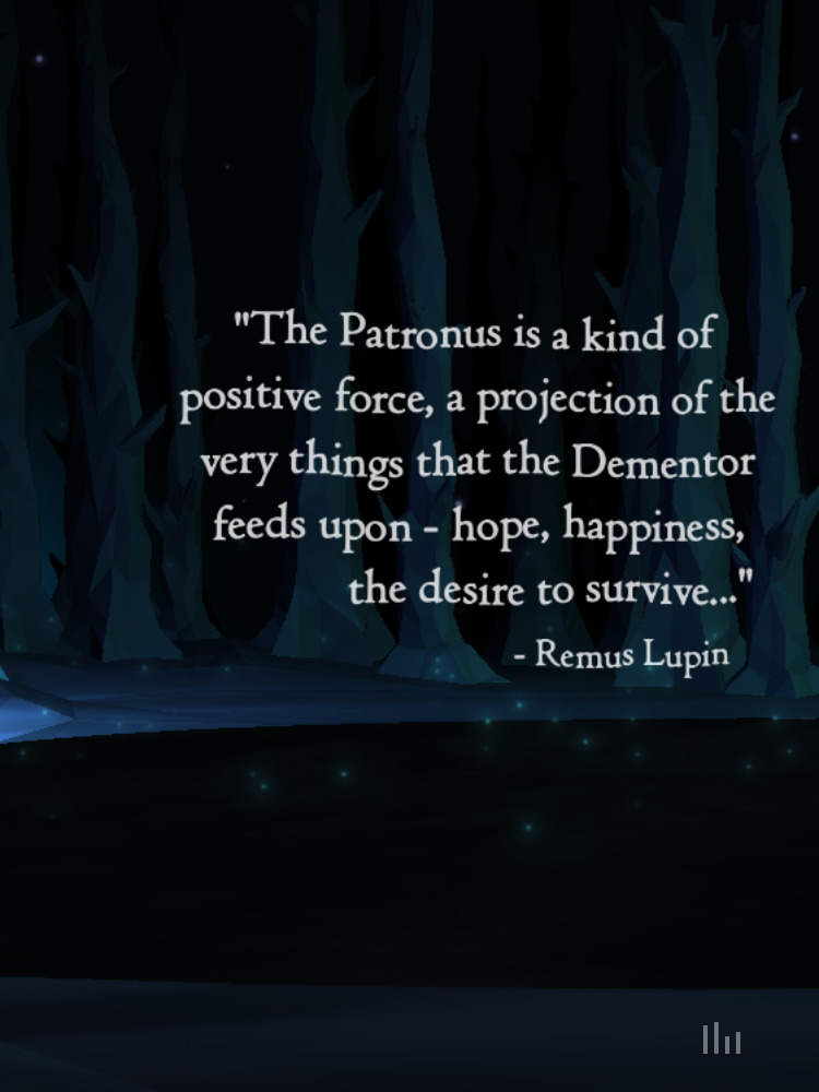 디멘터는 사람의 행복을 빨아들이고 절망을 느끼게 하는 것으로 힘을 얻는데, 패트로누스는 그대에게서 나오는 순수한 행복의 에너지라 절망을 느끼지 못하기에 디멘터는 패트로누스에게, 즉 그대에게 해를 끼칠 수 없고 이 덕분에 디멘터를 물리칠 수 있는 거지!