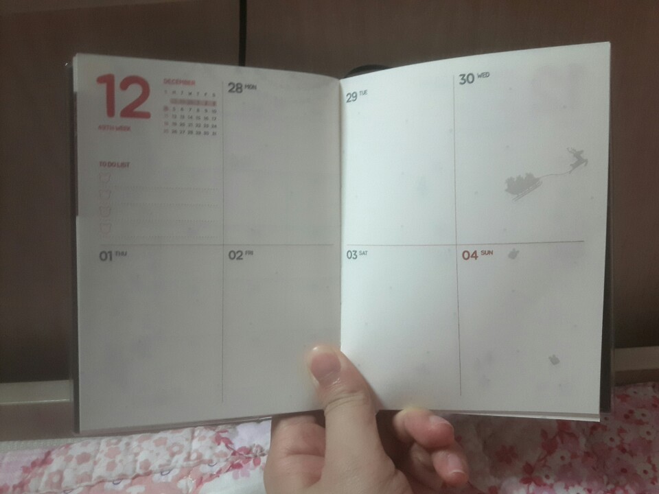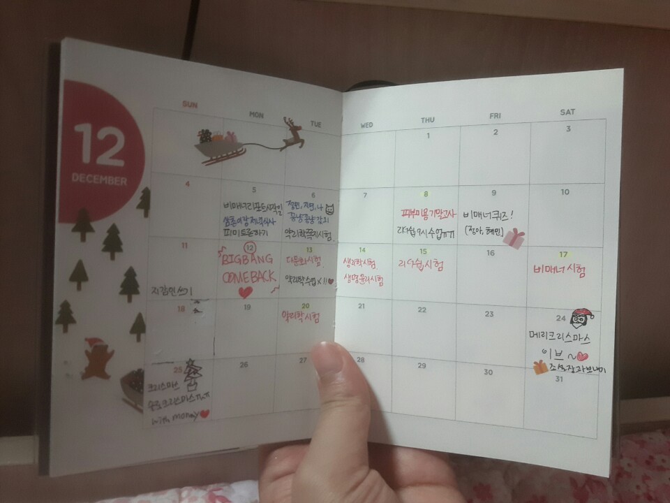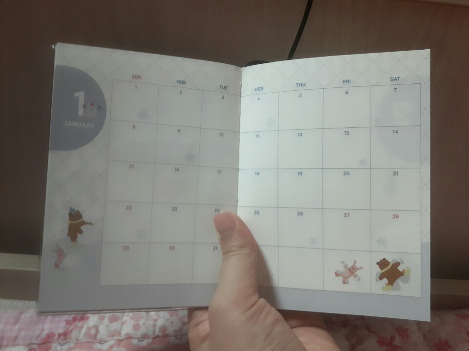 이런식으로 월간 페이지는 앞쪽에 몰아서 있어! 그리고 날짜는 인쇄되어 있어서 편한거 같앗 일러스트도 월 마다 달라서 좋아!! 내가 끄적여 놓은거는 무시해주라.. ㅋㅋㅋㅋㅋㅋㅋㅋㅋㅋ