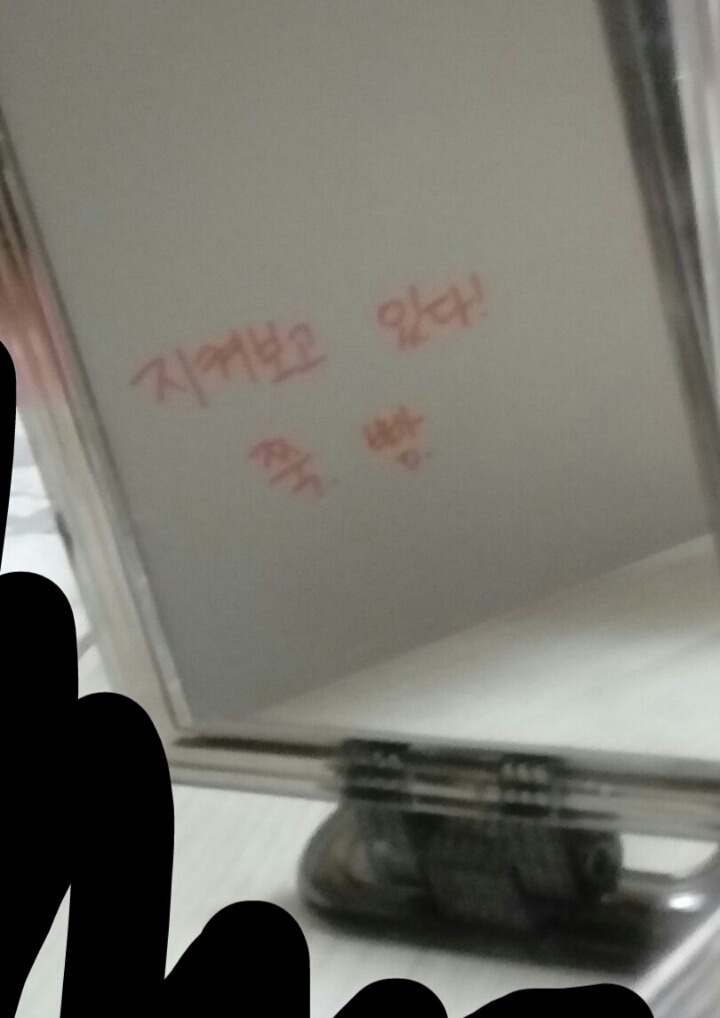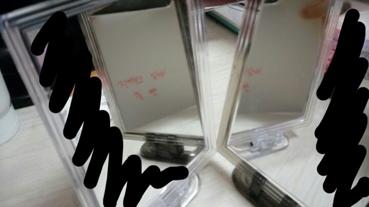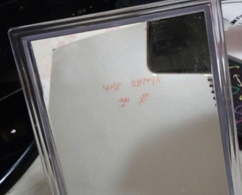위에 썼던 글을 거울 두개를 정면으로 비춰진 다음에 찍은사진이야