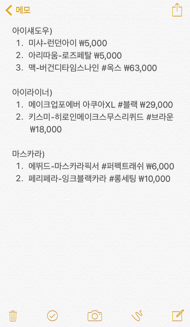 섀도우는 배치상 번호랑 좀 다른데, 사용한 순서대로 미샤-아리따움-맥이야!