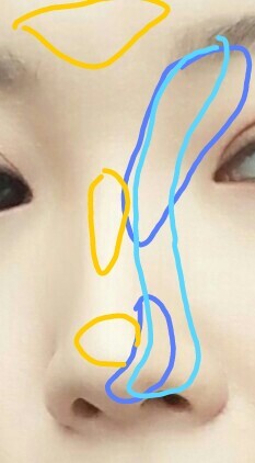 3. 팬브러쉬로 하이라이터를 퍽퍽 쓸어서 노란 부분에 발라줌. 베이스보다 하얀 컨실러로 해도 괜찮음! 이때 주의할 점은 콧망울부터 미간까지 쭉 이어 바르면 부자연스러우니 중간에 한번 끊어주셈~!!!