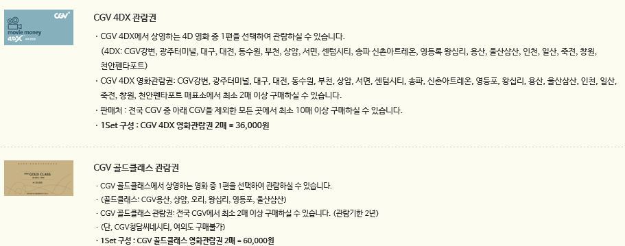 크게 CGV 영화관람권 (9000원), 3D 관람권(12000원), IMAX 관람권(15000원), 4DX관람권 (18000원)이 있어!