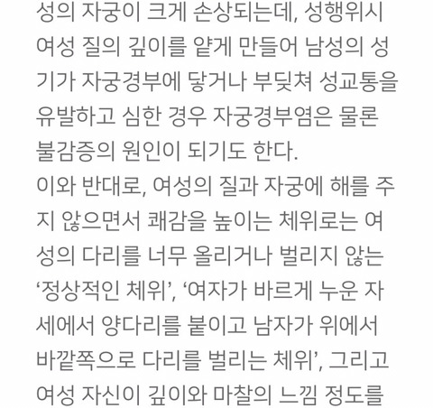 1. 다리 남자어깨에 올리는거 진심 하지마 ... 한번 했는데 쉬하는데 핏물이 쫙 나와서(처녀막 터진거 x) 개놀래서 병원갔더니 자궁경부암 검사해보자햇음 ㅠㅠ
