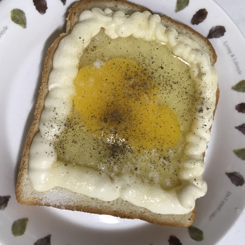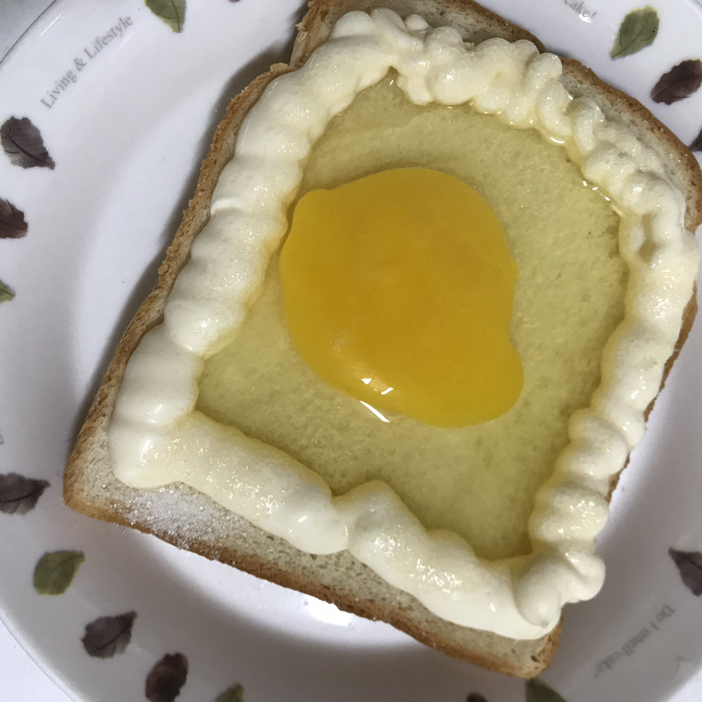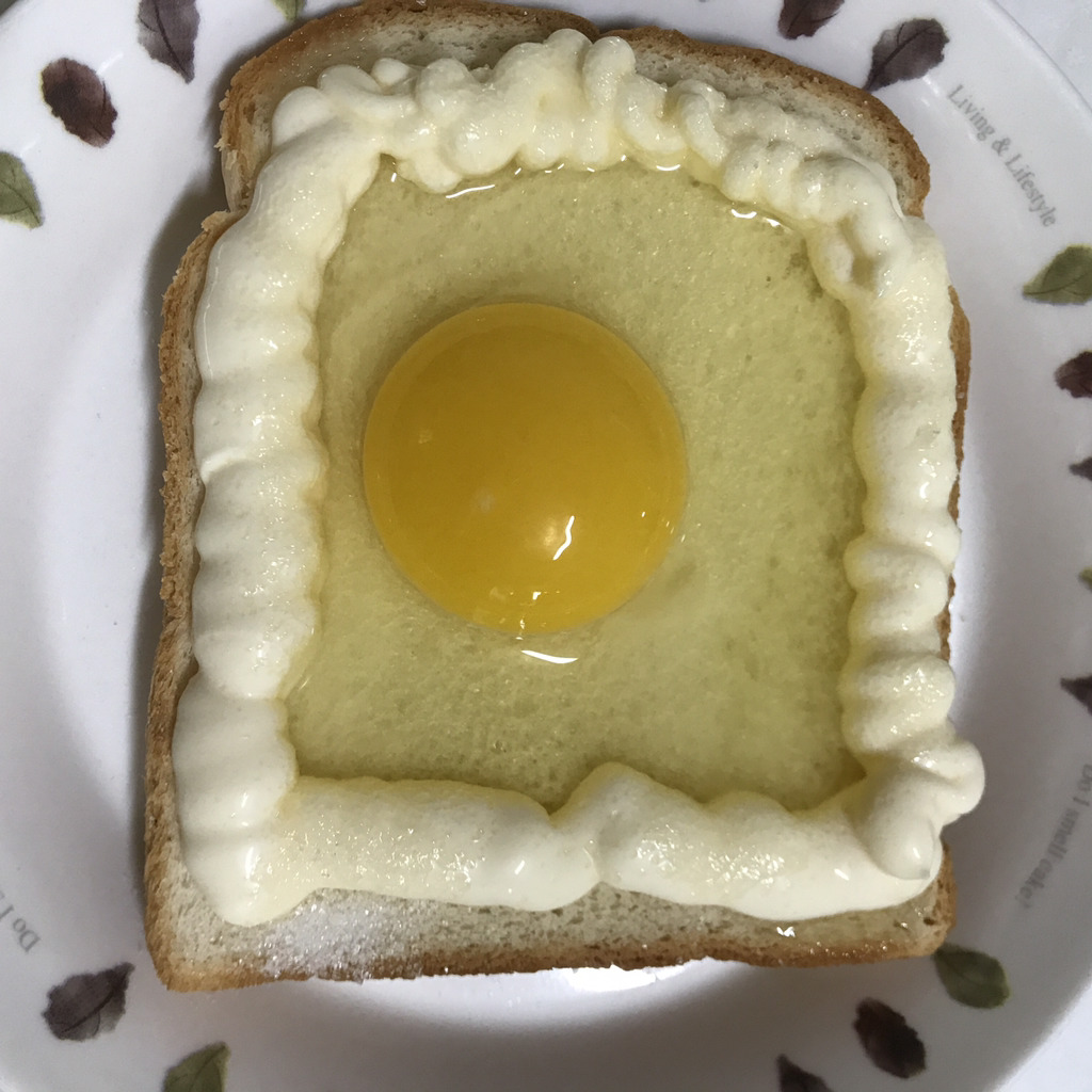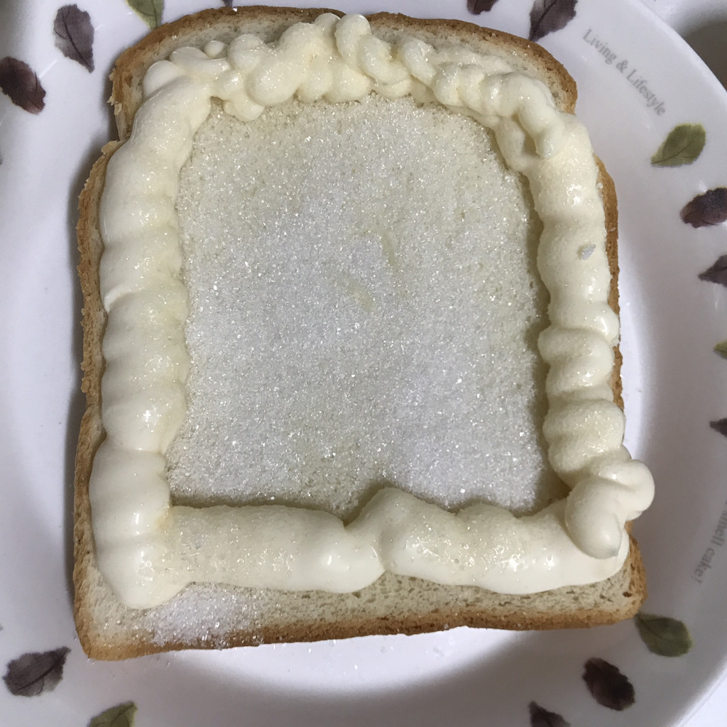 먼저 식빵 윗면에 설탕을 뿌려준다. (설탕뿌린거 먼저 찍고 마요네즈 올려야되는데 까먹었다.) 난 단거 좋아해서 조낸 뿌렸음. 근데 저정도는 뿌려야 맛있다 그러니까 걍 저정도 뿌려라.(강요) 그리고 마요네즈를 테두리에 두껍게 짜주는데 적어도 손가락 마디 굵기 정도로는 짜줘야됨 왜냐면 .. 저안에 계란을 까넣어야하니까.. 낮게 짜면 계란이 흐..흘려버렷...!!
