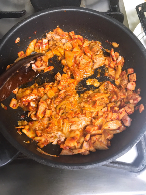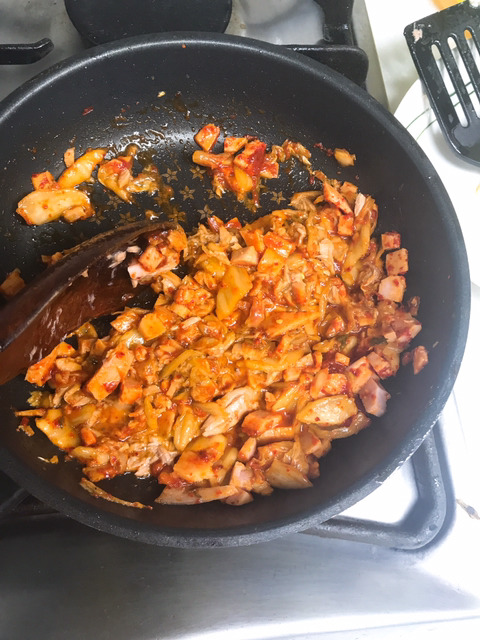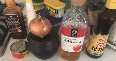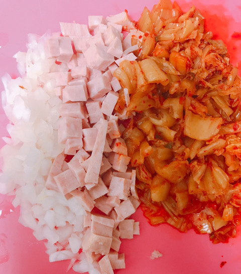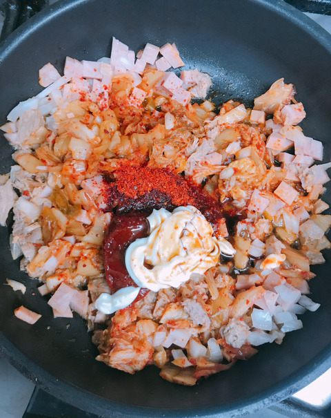 햄,참치,양파,익은 김치, 고춧가루,고추장,올리고당,캡사이신,마요네즈,참기름,간장