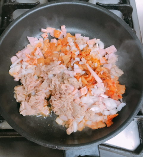 썰어놓은 햄,양파,김치와 참치 투입!