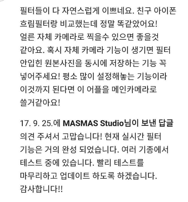 ++ 댓글로 다들 말한 실시간 필터 적용은 개발 중에 있는거 같아! 언제 업데이트 될지 모르겠지만 기다리면 언젠가 실시간 필터 적용 가능할듯!