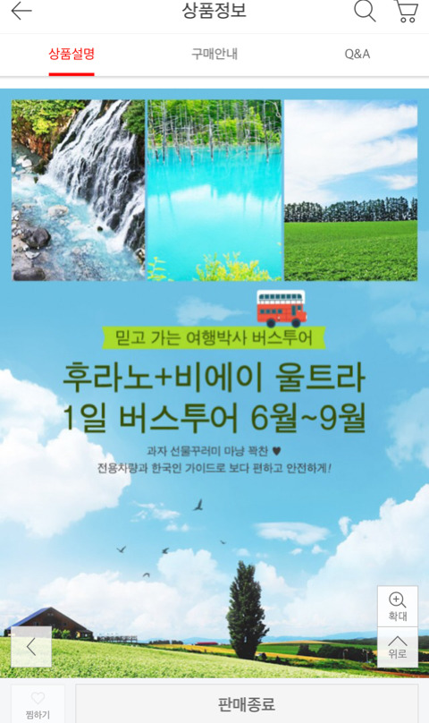 좀 더 검색해 보니까 후라노-비에이 버스 투어가 있더라고. 내 여행 계획 타입이 투어를 하는 건 맞지 않는데 청의 호수를 너무 가고 싶어서 네이버 블로그를 열심히 검색했어. 일정이 조금씩 다르거나, 가격 차이가 조금 있거나 정도의 차이였고 청의 호수는 모든 투어가 다 가더라구. 그렇게 호의적이지 않은 후기도 있긴 있었지만 그래도 대부분 호의적이었고 투어로 가는 거 아니면 아무래도 일정이 쉽지 않겠다 싶어서 위메프, 티몬, 쿠팡에 후라노 비에이 버스 투어를 검색했는데 위메프에 여행박사에서 가는 버스 투어 일정이나 가격이 마음에 들었어.