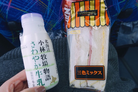중간에 휴게소 잠깐 들렀고, 휴게소에서 냉장 보관해서 받은 샌드위치랑 우유야. 낙농업이 발달한 홋카이도에 온 만큼 병? 플라스틱? 어쨌든 팩이 아닌 우유를 주는 점에서 좋았는데 맛 진짜 좋더라 엄청 고소했어! 내가 흰우유를 좋아하기도 해서 더 그랬을지도 모르겠지만 진짜 맛있었어