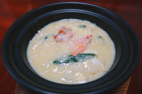 처음에 가니 이런 상차림이 나왔고, 위에는 게 삶은 거, 아래 왼쪽은 샐러드, 그 옆은 계란찜, 오른쪽은 샤브샤브처럼 먹는 건데 야채들이랑 게가 들어있었어
