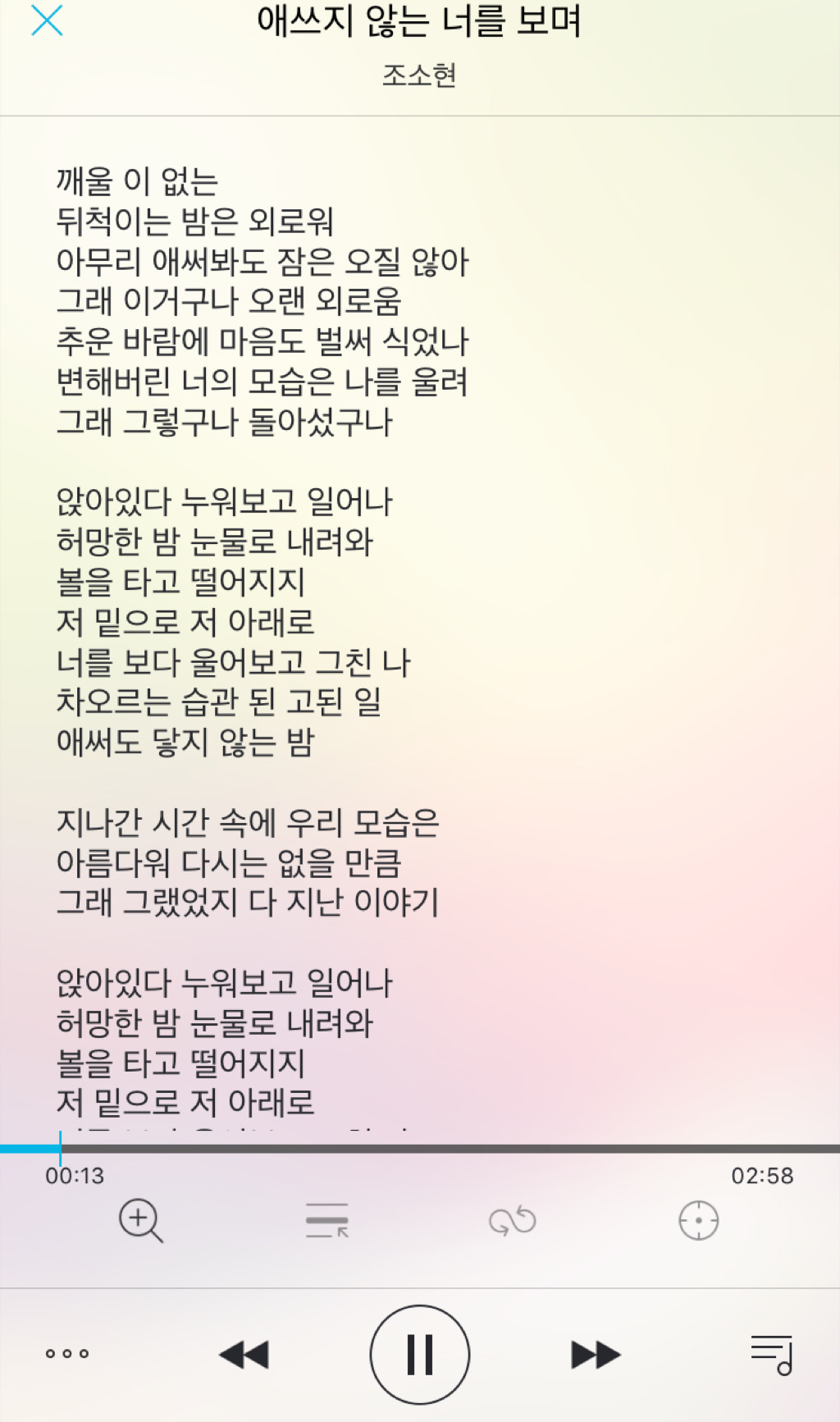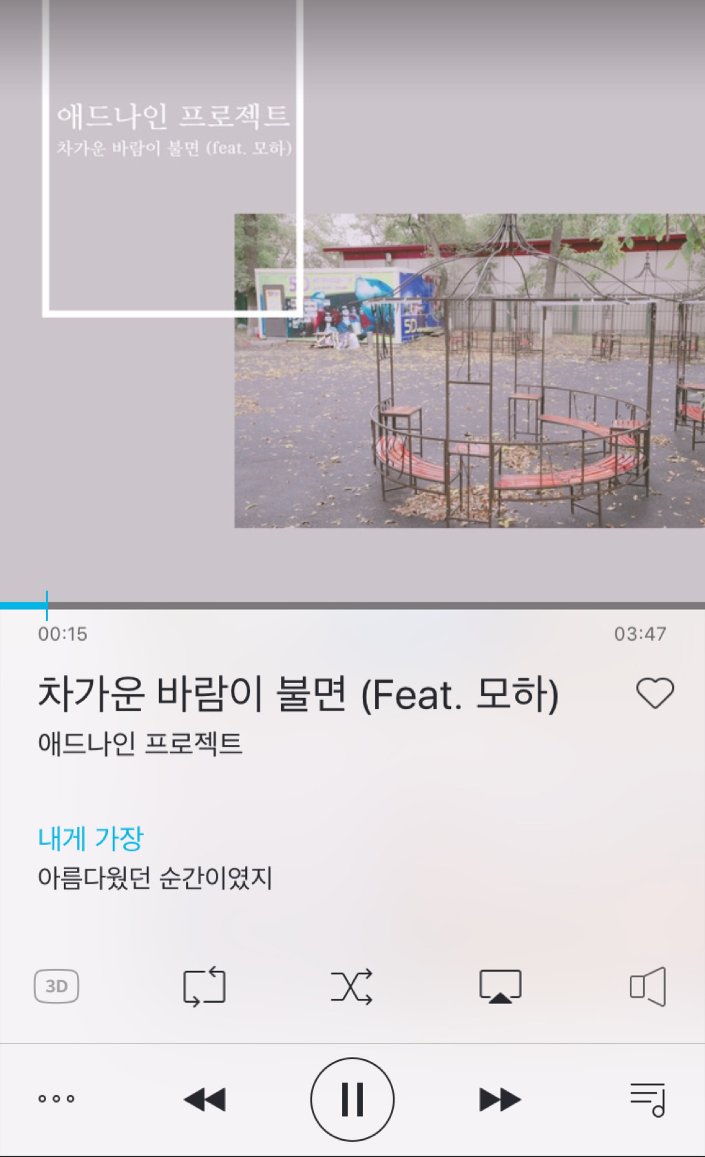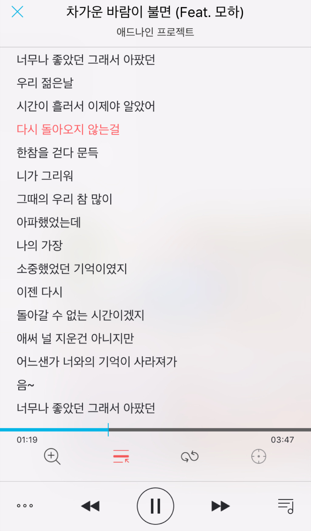 이 노래는 청춘시대 삽입곡이라서 접하게 된 노랜데 드라마 보면서 노래 듣자마자 바로 재생목록에 넣고 진심 맨~날 들었어 이 노래는 그냥 너 돌아와줘가 아니고 진짜 그때가 좋았고 그리워 가 딱 들어맞는 노래야 좀 괜찮아지고 나서 이 노래 들으니까 나도 예전의 그때가 그리웠던거지 그렇게 막 돌아가고싶은건 아니였을 수도 있다는 생각이 들더라!
