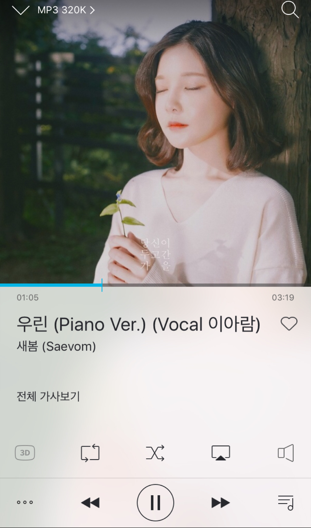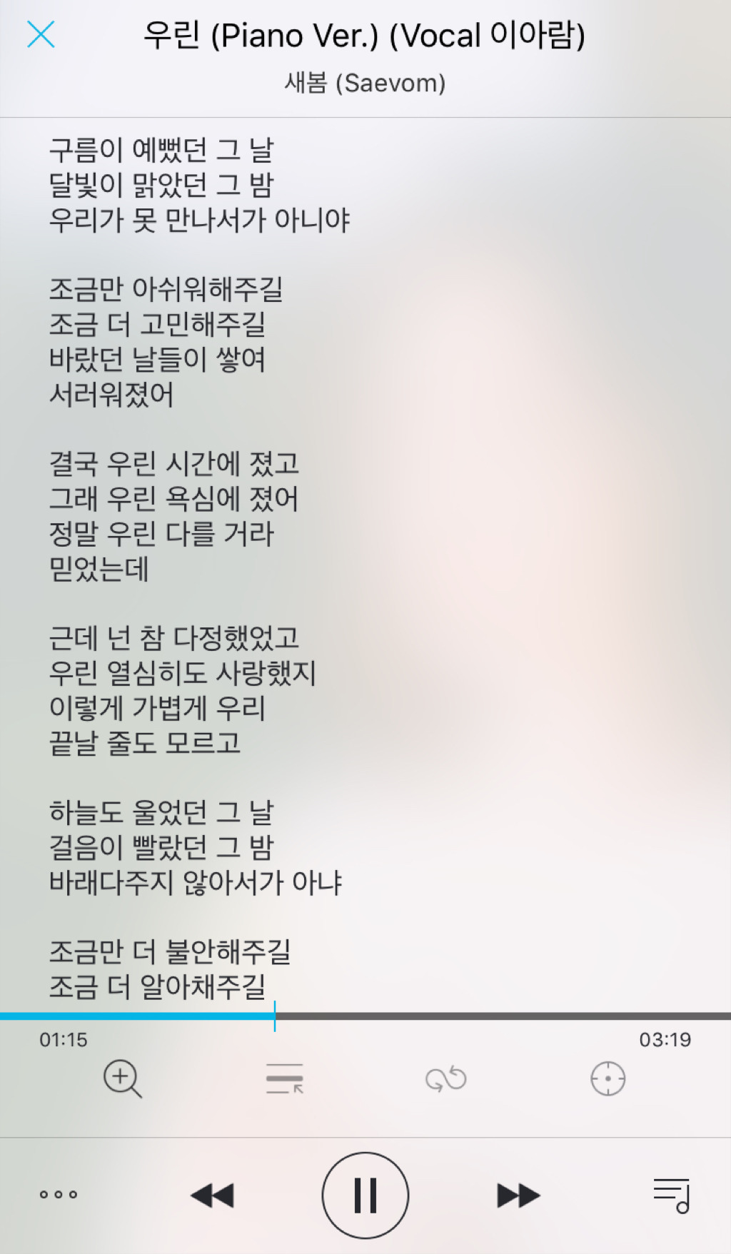 크으 이별노래의 대명사 새봄 노래야 난 오리지날 보다 피아노 버전이 더 좋았어 '결국 우린 시간에 졌고 그래 우린 욕심에 졌어 정말 우린 다를거라 믿었는데' 라는 가사가 너무 와닿더라 진짜 꼭 들어봐 이 노래 꽂혔을때 맨날 이것만 반복재생 하고 다녔어 ㅠ