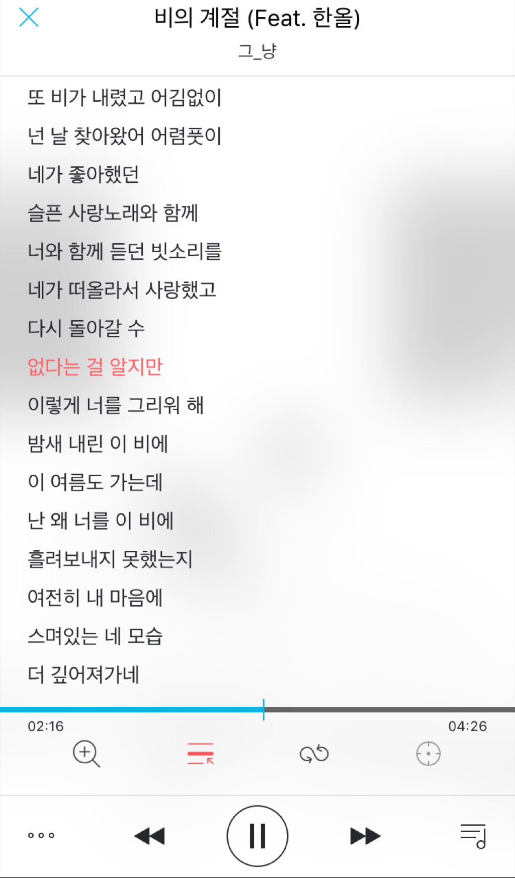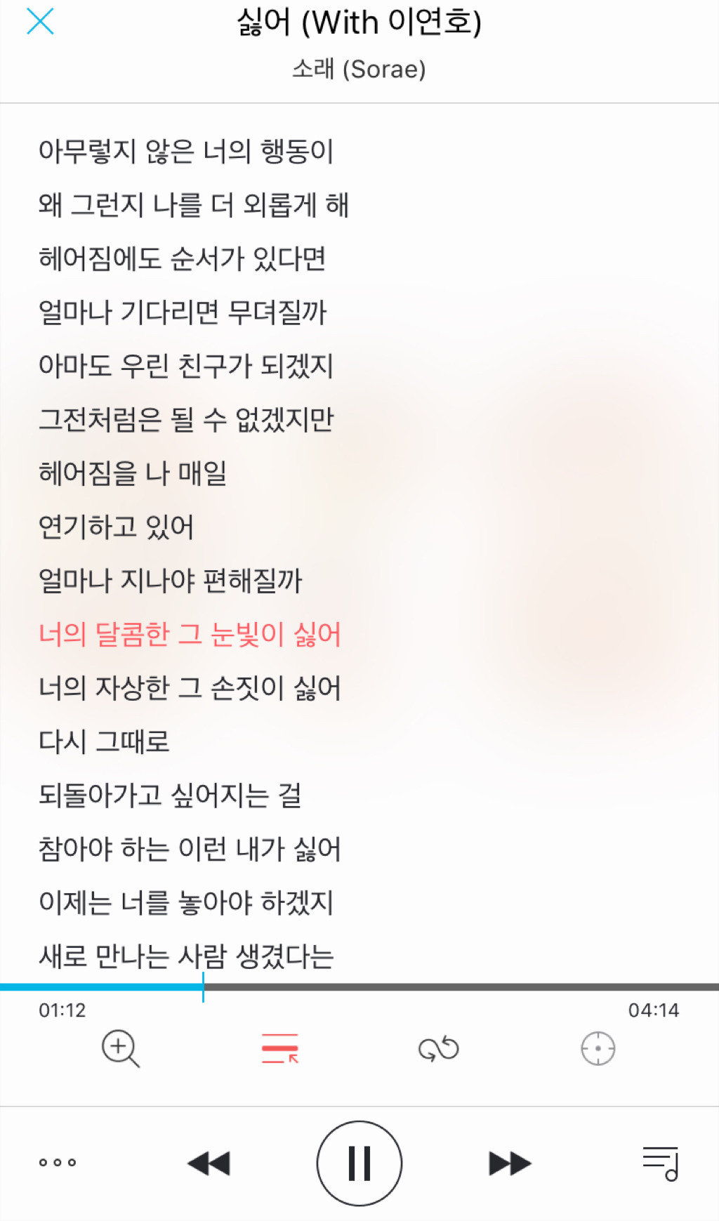 대놓고 너 돌아와 제발!! 죽을거같애!! 이런 노래의 가사보다는 그때는 그랬지 너무 그리워 그래서 돌아왔으면.. 이 살짝 감미된 쪽의 노래들이 많아 전남친이랑 완전히 연락 끝내고 너무 힘들었을때 노래로 달래 보려고 가사 하나하나 봐가면서 진짜 신중히 담았던 노래들이야!