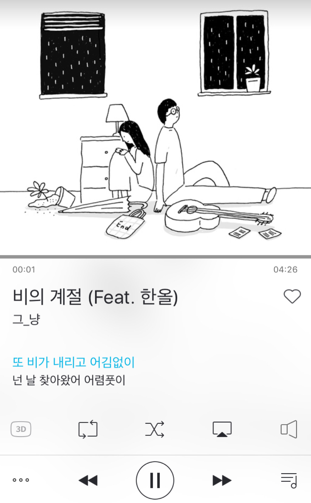 그냥노래는 다들 한번씩 들어봤지? 이 노래도 좀 유명한 것 같아서 안넣으려고 했는데 너무 좋은 노래라서 더 많이 알았으면 좋겠어서 넣었어! 비가 올때면 니가 떠올라서 너무 그리워서 비가 그치고 여름이 가도 너는 못보낼거같다 라는 내용을 담고있어! 남녀듀엣 노래라서 더 좋고 잔잔하기도 해서 새벽에 듣기 좋은 것 같아