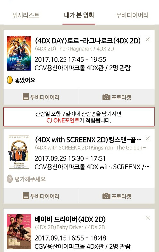 그리고 내 기억으론 4번이상 4dx보면 1+1 쿠폰 나오고, 멤버십 카드 1년 연장이었고