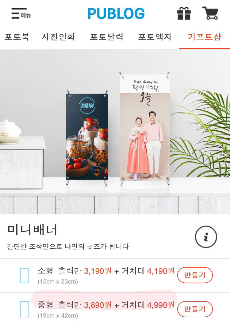 - 가격 : 미니배너 4990원 (거치대 포함, 배송비 별도) / 증명사진 장당 1000원 / 지갑사진 두 장 390원