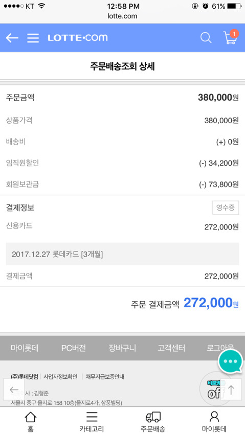 그래서 공홈에서 사려다가 롯데임직원이라 할인가능해서 롯데닷컴에서 구매! 정가는 380000원이고, 34000원 임직원 할인 받고, 전에 물건 반품한 게 있어서 가지고있던 예치금 포함해 272000원으로 최종구입했어:)