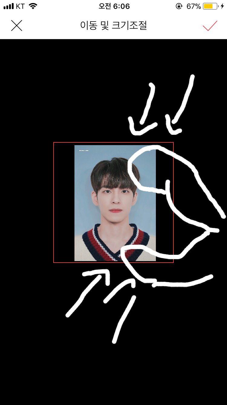 그림처럼 사진을 집게손으로 스크롤해서 줄여주고 빨간 네모 안에 맞춰준다😀