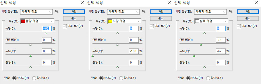 붉은기를 없애고 싶다면 빨강 계열에서 녹청 플러스