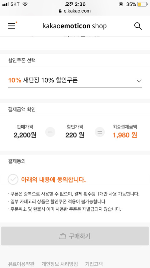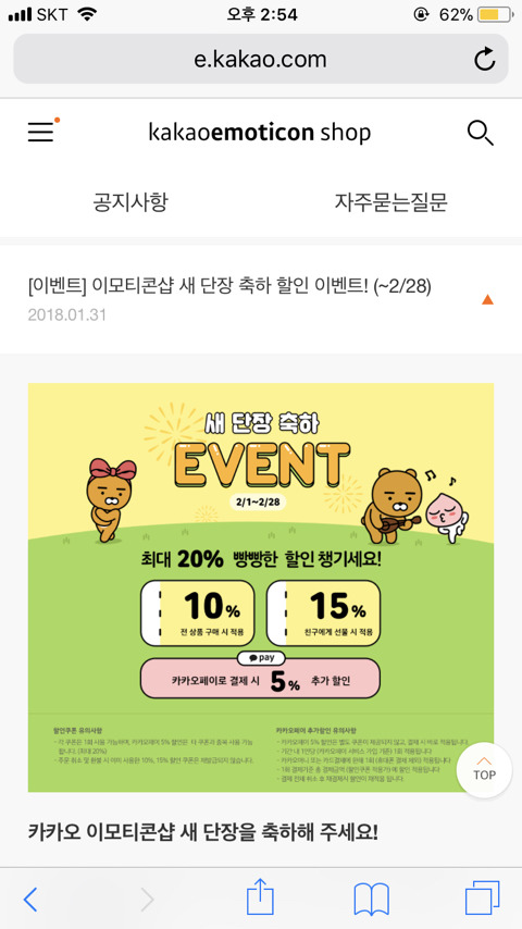 10% 구매 쿠폰 또는 15% 선물 쿠폰을 1종 적용하고 카카오페이로 결제하면 최대 20% 할인!!