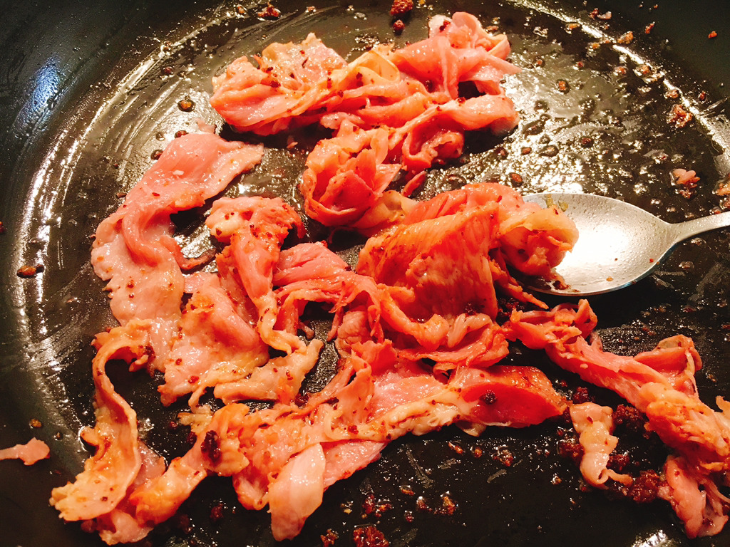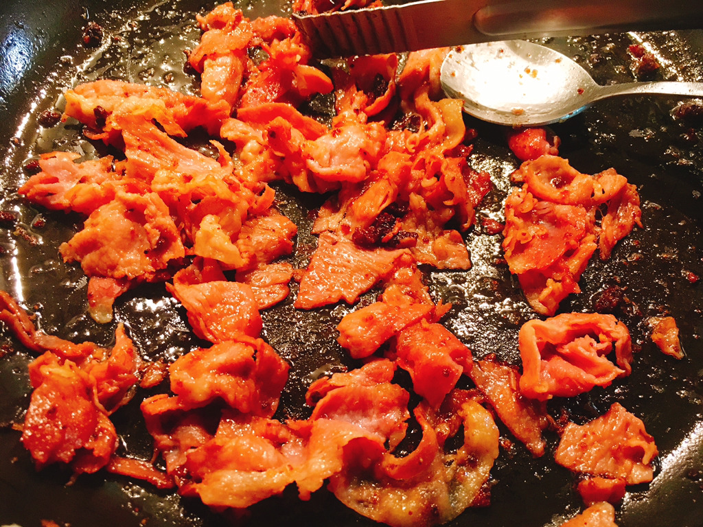 베이컨 촤~! (난 안익힌 갑각류 못먹기 땜시 해물도 이때 넣어부러~ 물론 조개같은 해물은 해감을 해주어야겠지라~?)