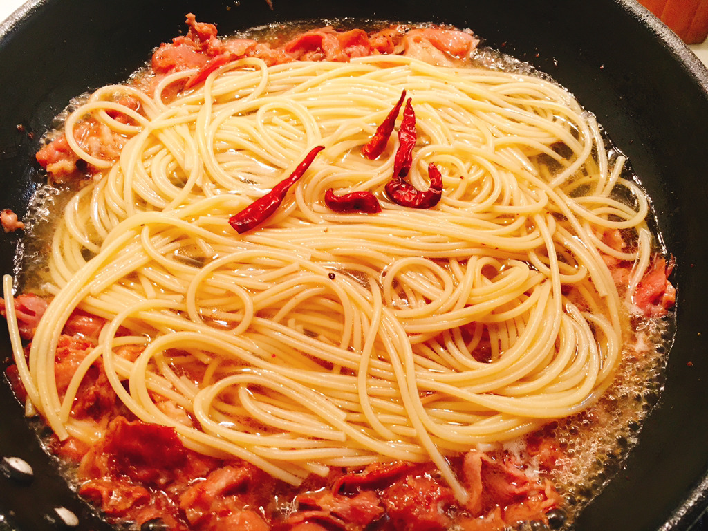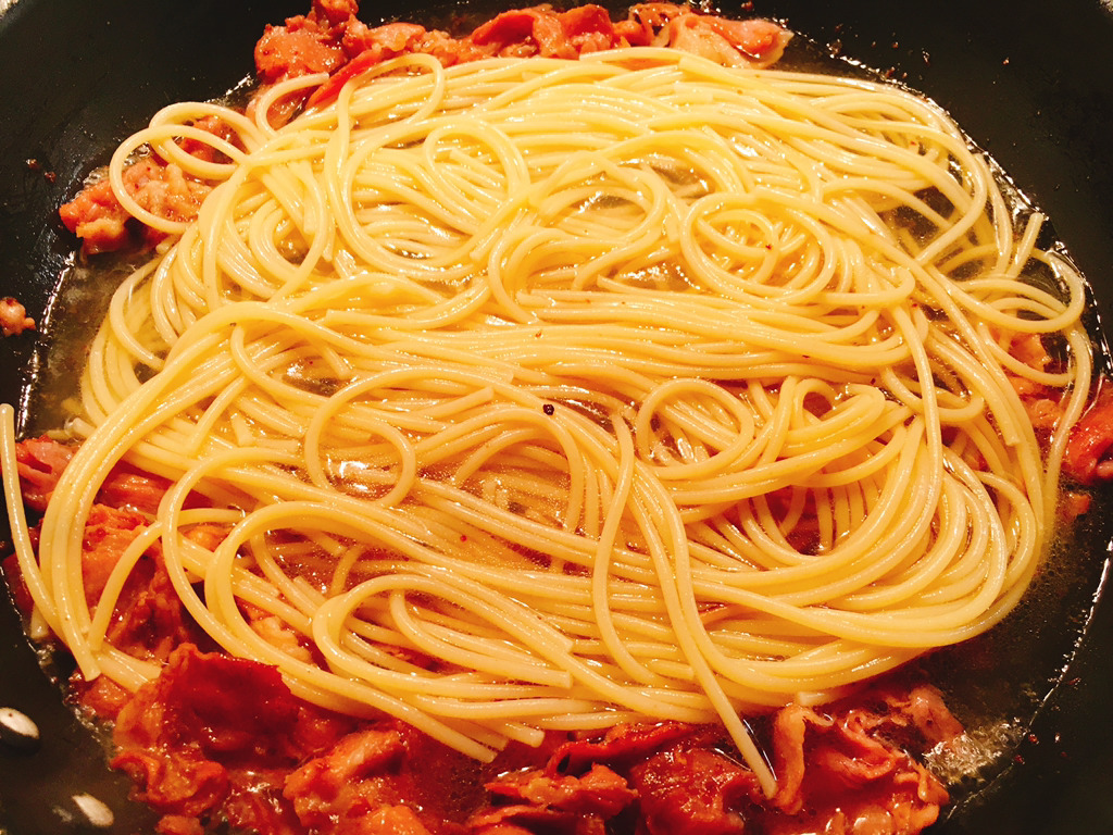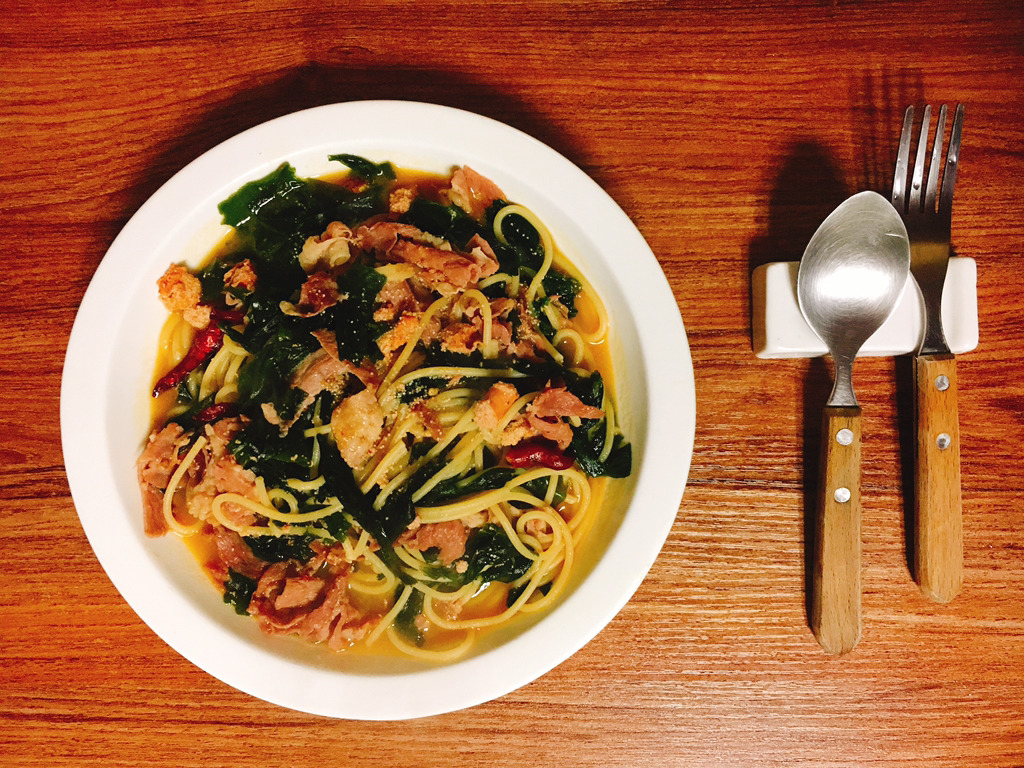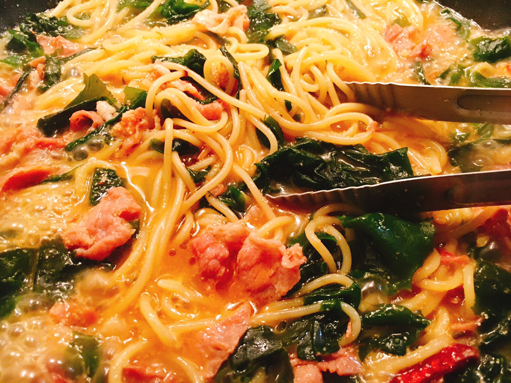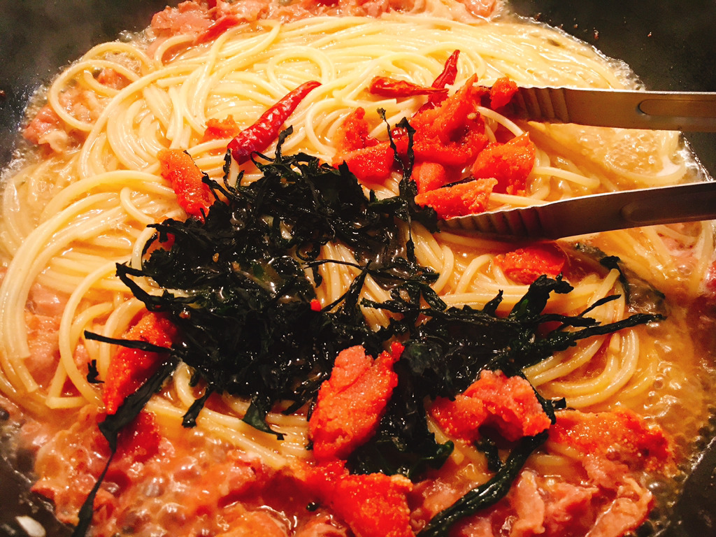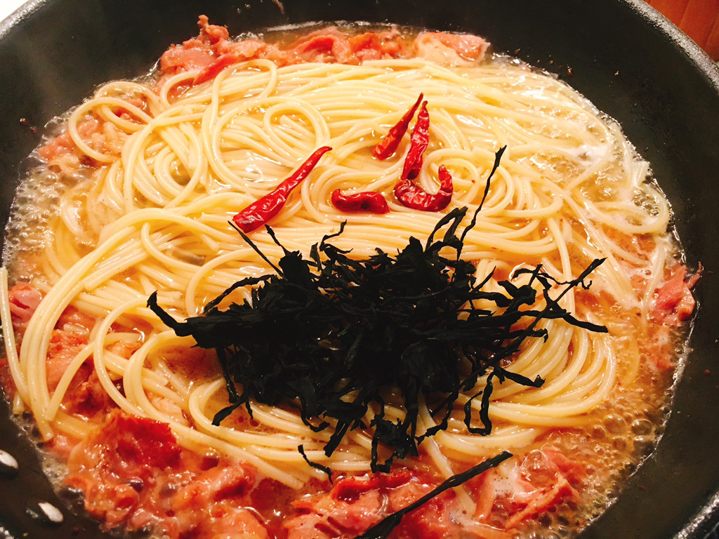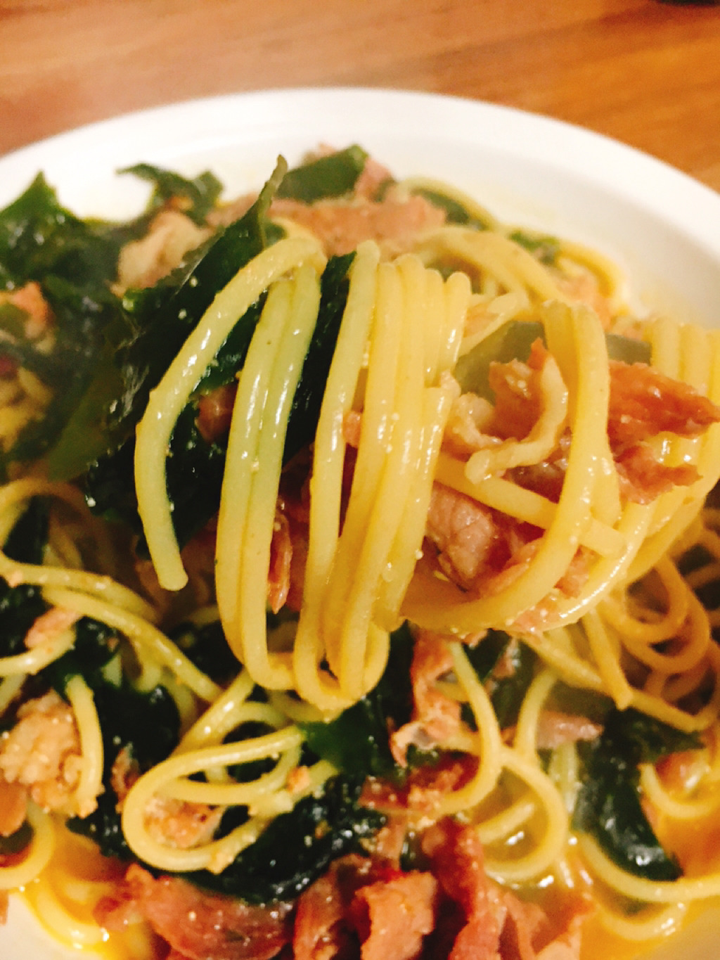 파스타면 1인분, 건미역 한줌 (자잘한 잎부분), 명란젓 크기에 따라 한두덩이, 베이컨 적당량 (난 없어서 베이컨으로 한거고 홍합이나 모시조개, 새우 같은 해물이 훨씬 잘어울림)
