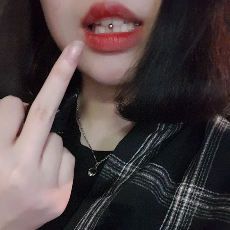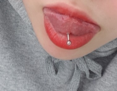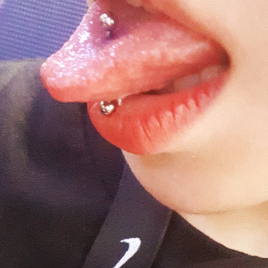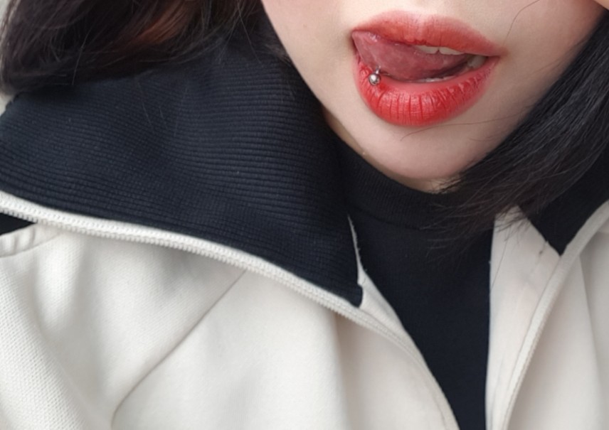 정면에서 봤을땐 이런 모습! 피어싱 바가 긴건 앞으로 엄청나게 부어 오를 예정이기 때문이야.. 다 붓기가 빠지면 자신의 혀 사이즈에 맞는 피어싱으로 갈아 끼우자. 그리고 일주일정도는 면이나 콩나물먹는건 자제해줘야해. 피어싱에 감겨서 완전 아파ㅠㅠㅠㅠ.