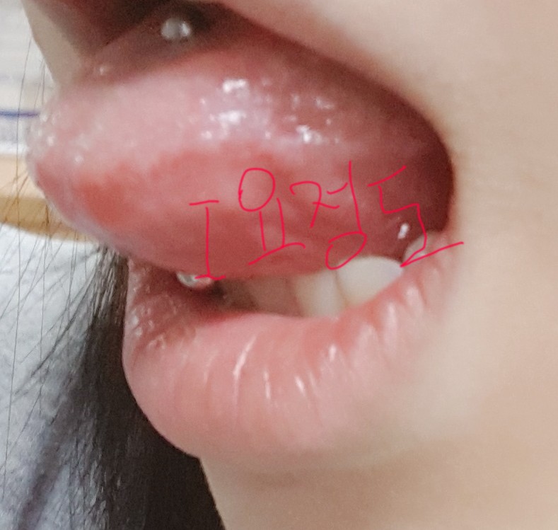 붓기가 많이 빠졌지? 그래도 잘 보면 혀 밑 부분이 약간 하얀게 보일꺼야 아직 낫고 있는 중