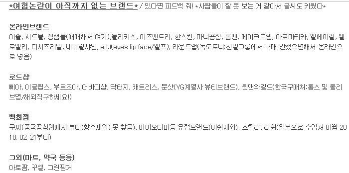 ์ด์, ์๋๋ฌผ, ์ ์๋ฌผ(์ ๋งคํด์ ์ฌ๊ธฐ),๋๋ฆฌํค์ค, ์ด์ฆ์คํธ๋ฆฌ, ํ์คํจ, ๋ง๋ ๊ณต์ฅ, ๋กฌ์ค, ๋ฉ์ดํฌํ๋ , ์๋ก๋งํฐ์นด, ์์์ด๊ฑธ, ๋ฉ๋ก๋ฉ๋ฆฌ, ๋์์ฆ๋ฆฌ์ผ, ๋ค์ธ๋ด์ค์ธ, e.l.f(eyes lip face/์ํ), ๋ผ์ด๋๋ฉ(๋ ๋ํ ๋:์น์ผ๊ทธ๋ฃน์์ ๊ตฌ๋งค ์ํ์ผ๋ฉดํด์ ์จ๋ผ์ธ์ผ๋ก ๋ฃ์)