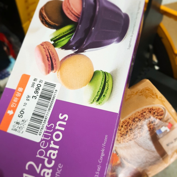 이것은 이마트에서 파는 냉동?피코크 마카롱 이고 원가 7,980원!!! 참고로 저 초록이는 녹차맛 안남(초록이 피스타치오맛 이래!). 뻘건거는 딸기같은데 몇번 생각하면서 먹어야지 딸기맛이 좀 나는편. 초코는 쫌 진하고 바닐라가 젤 맛있었음 안에 견과류가 살짝 있는거같음! 너무 얼구면 치아가 약간 아픔