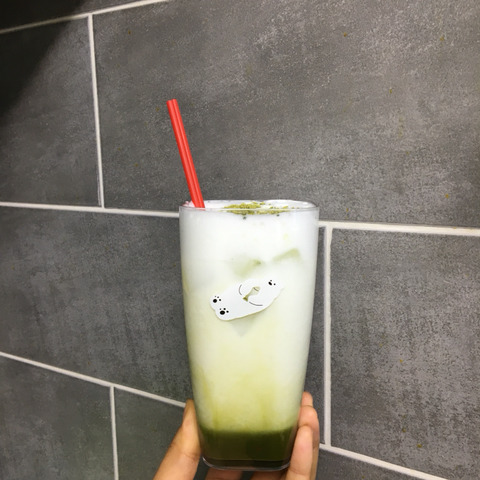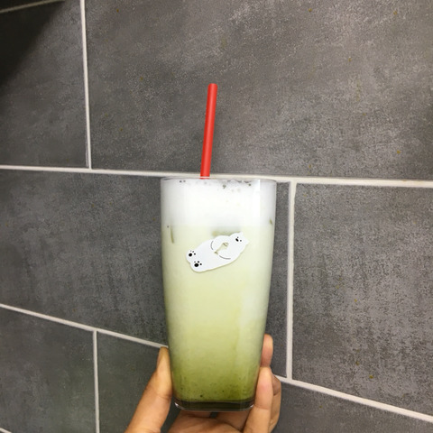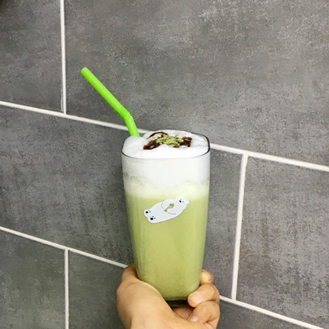 녹차라떼 위에 방금 만든 우유거품을 올리고