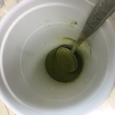 먼저 이 녹차라떼 파우더를 아빠수저로 한스푼 넣어줘