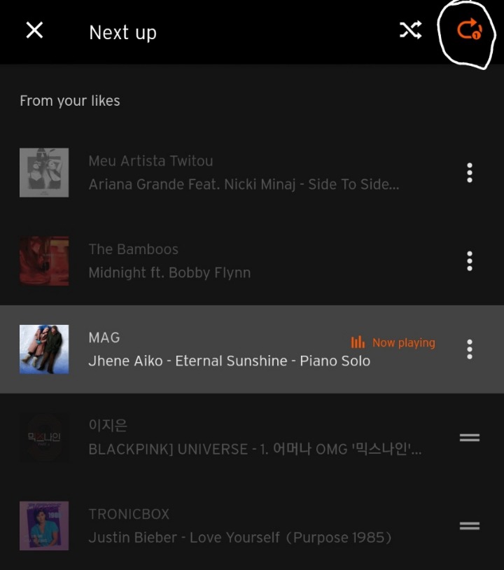 3. 내 플레이리스트에서 반복재생 하고싶은 곡 골라서 저 동그라미 부분을 두번 클릭해주면 됩니다!