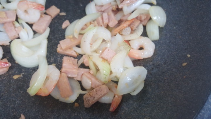 양파 스팸 자른거 넣고 센불로 볶아라! 양파가 살짝 노릇해 질때까지!