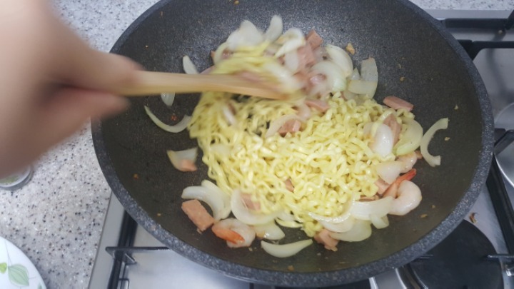 쫄깃한면 원하면 5분 다 삶지말고 3~4분만 삶아서 팬으루 옮겨라 어차피 팬에서 한번 더 볶음 ㅎ