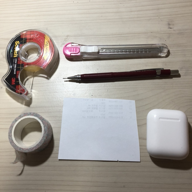 👇준비물 : 테이프, 마스킹테이프(난 다이소에서 샀어), 칼, 에어팟, 종이, 펜, 가위(사진엔 없지만)
