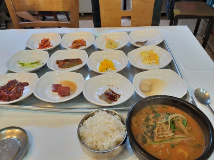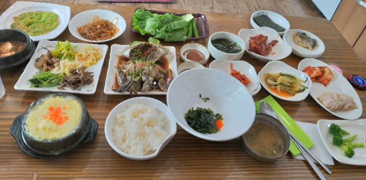 간장게장 양념게장 생선구이 수육&김치 브로콜리&초장 다양한 나물들 전 잡채 청국장 시래기국? 열무김치 오이냉국 하나는 뭐였는지 생각이 안 나네...