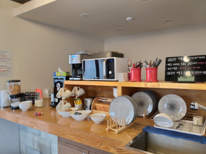 여기도 다른 곳처럼 먹고 난 후 사용한 식기들은 본인이 설거지해야 해!