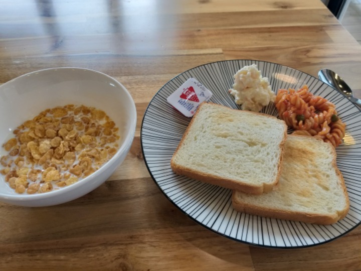 씨리얼 우유 커피 식빵 딸기잼 감자샐러드 하나는 이름을 모르겠는데 밑에 사진에 있어ㅠㅠ