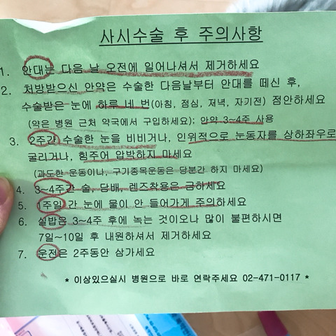 이후부턴 기억이 잘 안나는데 수술실 안에 있던 다른 침대에 옮겨지고 엄마 오고서 약간 눈물남 내가 30분 걸렸냐 하니까 40분 정도 걸렸다고 했어 여차저차 다시 진료실로 가서 눈동자 확인하고 눈 사진찍고 뭐라고 했는데 정말 기억이 안난다 암튼 수술 잘마치고 눈에 솜안대 같은거 붙이고 약처방 받고 인사하고 나왔어