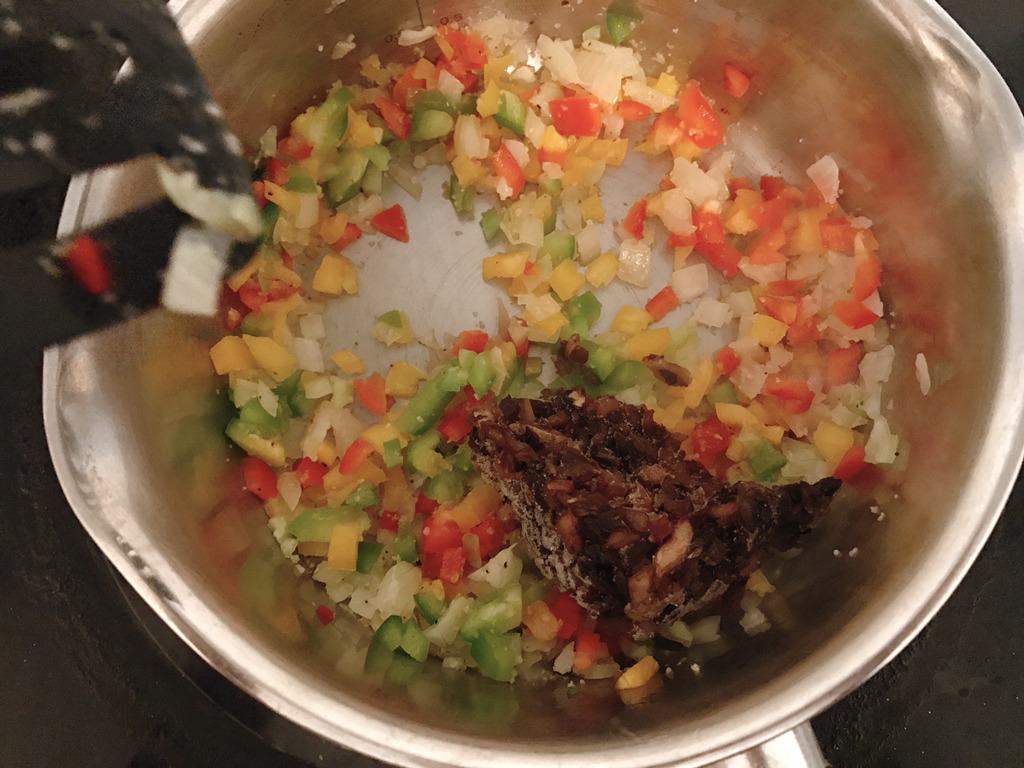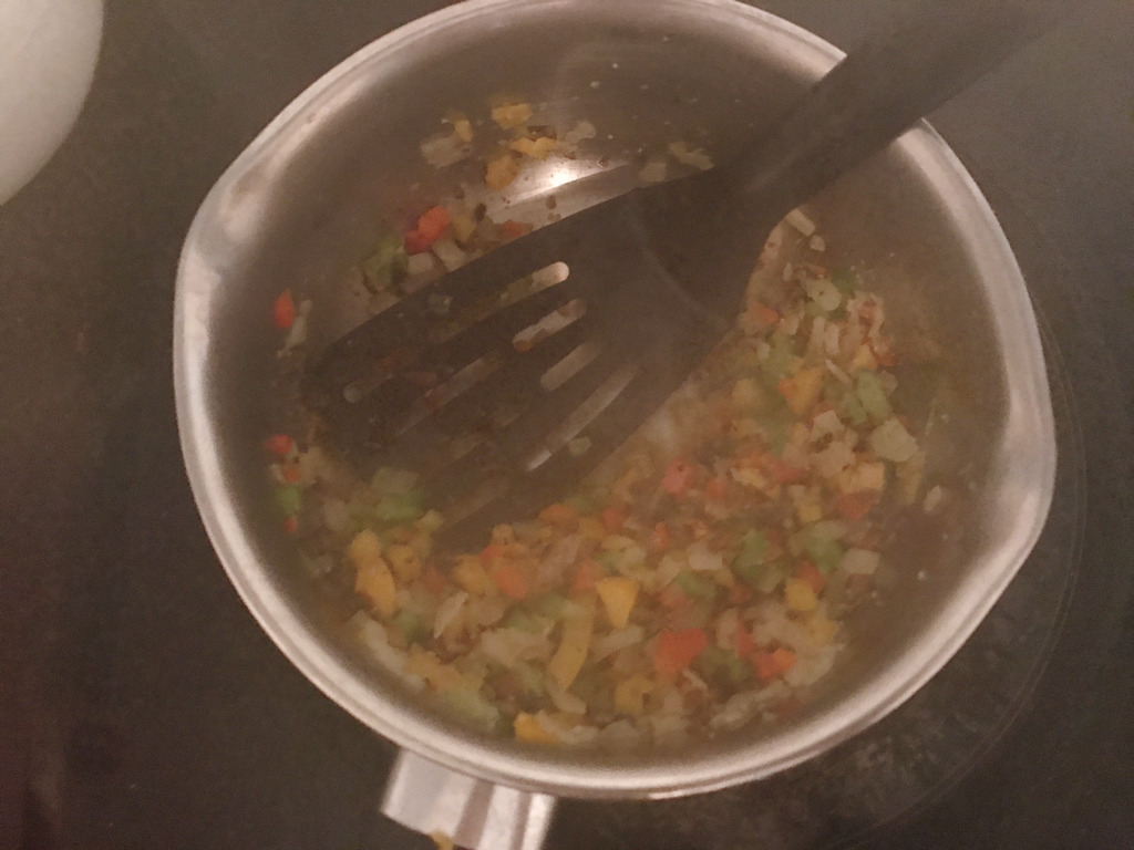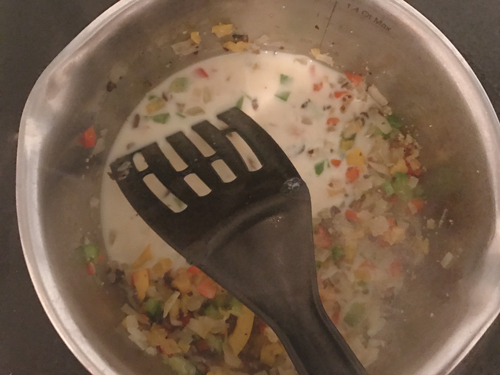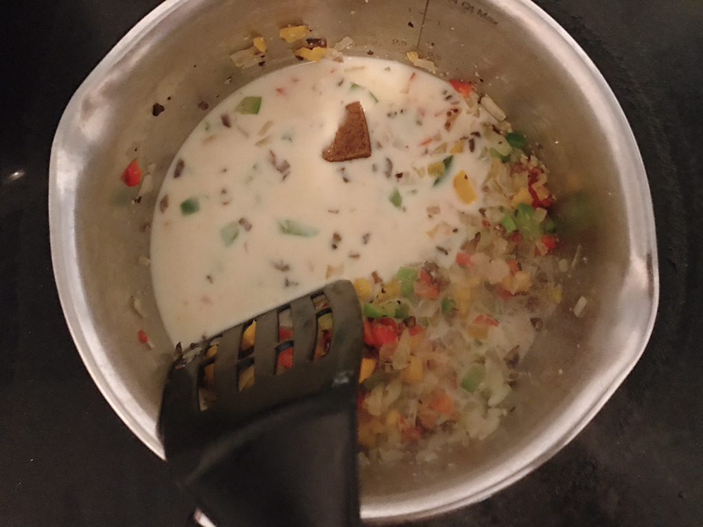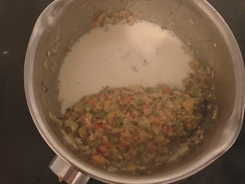 채소가 어느정도 볶아지면 불을 좀 더 올리고 두유 반컵(다 붓지마!!)을 부어줘 비프스톡(1/4개 정도)을 두유에 잘 풀어줘