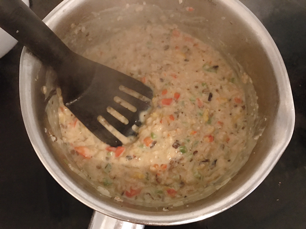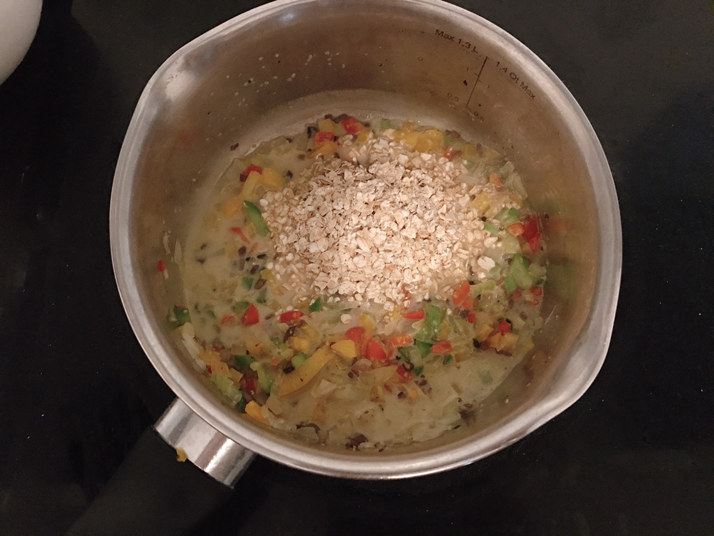비프스톡이 다 녹으면 채소와 두유를 골고루 섞어주고 오트밀을 투하해줘! 처음에는 센불에서 볶다가 두유가 끓으면 중약불로 낮추고 오트밀이 불 때까지 잘 끓여줘