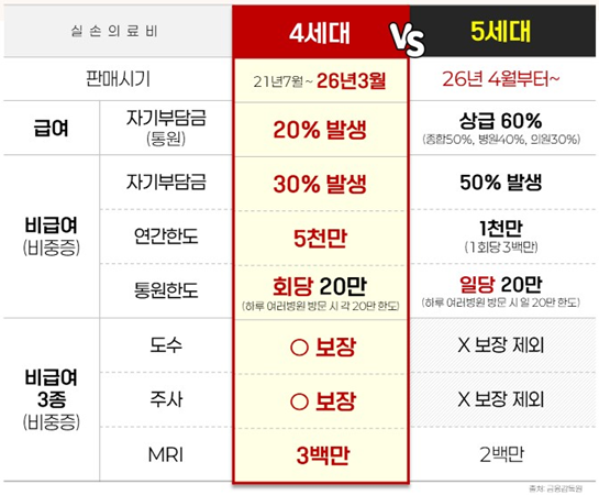 5세대 실손의 경우 첨부한 표처럼 경증질환에 대한 보장이 크게 줄어듭니다.