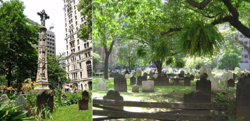<교회 옆의 묘지에는 증기선을 발명한 로버트 풀턴, 뉴욕에서 처음 신문을 만든 브래드퍼드 2세가 잠들어 있다. 묘지임에도 월스트리트의 센트럴파크 처럼 휴식처가 되는 곳>