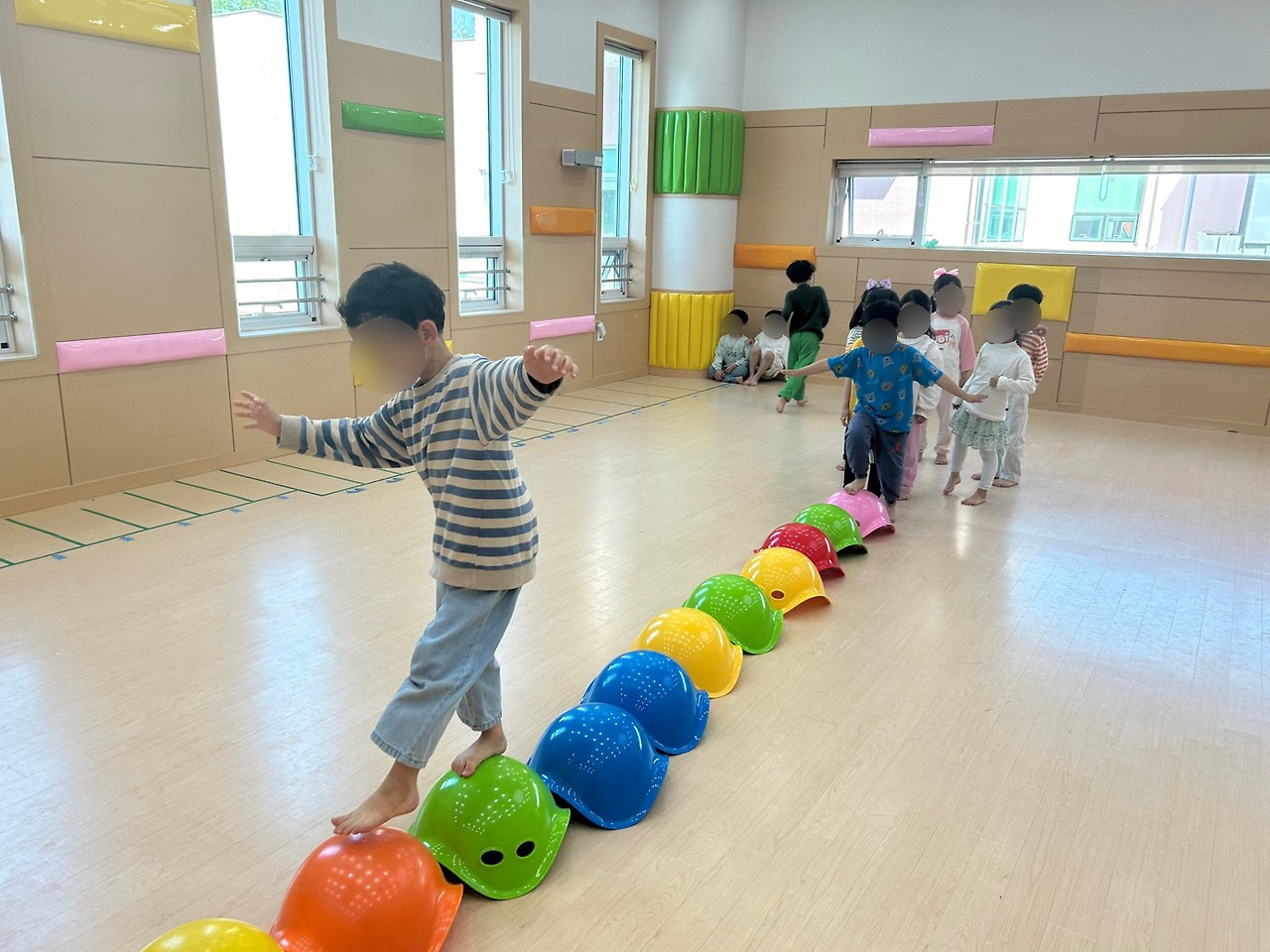 3. 부산유아체육 유아체육활동 : 빌리보 위에 올라가서 중심잡기를 합니다.